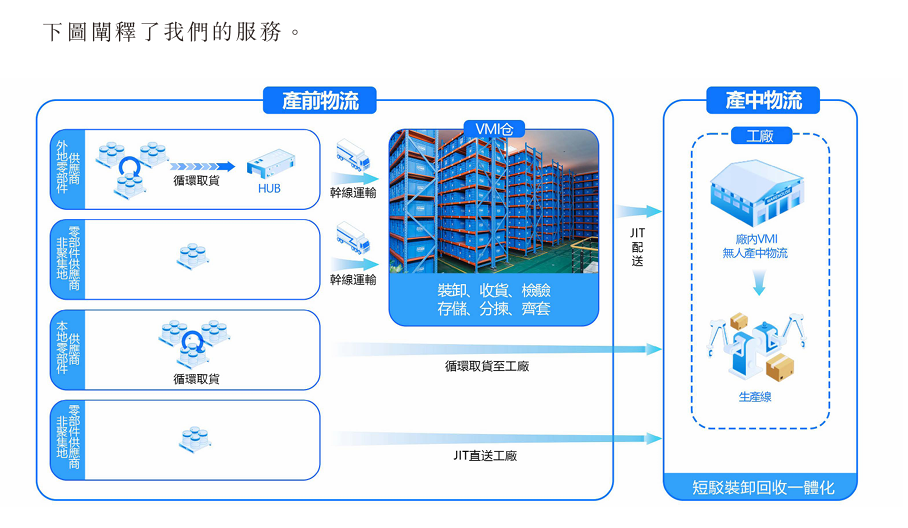 生产物流:帮工厂高效管理零部件供应,确保生产线不停工。比如,保证空调组装厂需要的螺丝、芯片都能在需要的时候精准送达。
