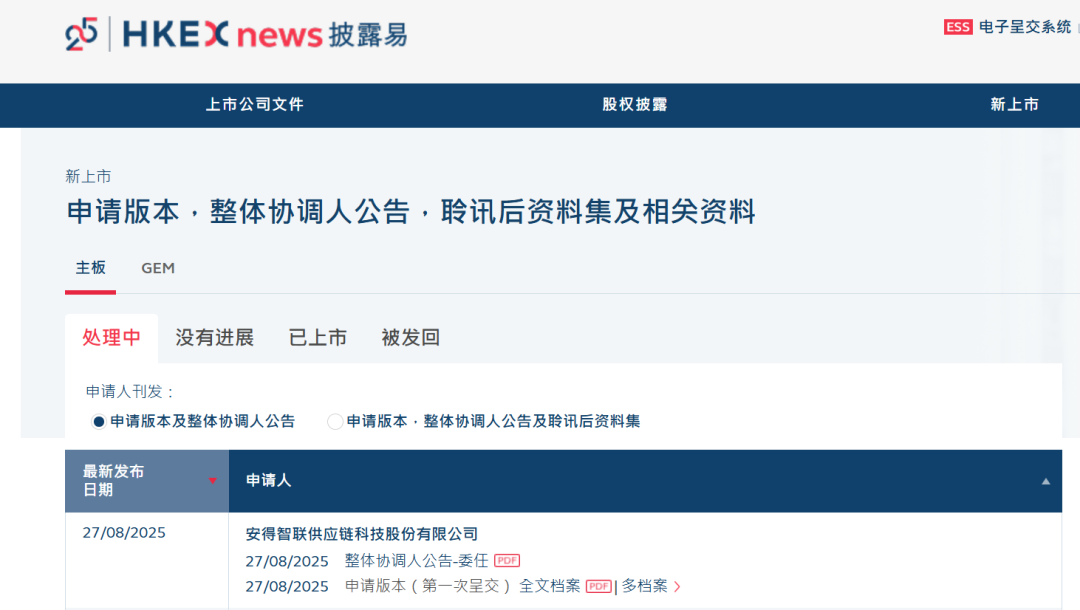 2025年8月27日,美的集团(000333.SZ/00300.HK)发布公告称,其控股子公司安得智联供应链科技股份有限公司(以下简称“安得智联”)已正式向香港联合交易所有限公司(联交所)提交上市申请,计划在联交所主板上市。
